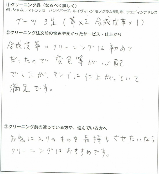 靴・ブーツのクリーニング・お手入れをご利用頂いた『お客様の声』です。協和クリーニングの評価・評判・クチコミを知ることができます。クリーニングの素直な感想や満足の言葉をいっぱい頂いています。