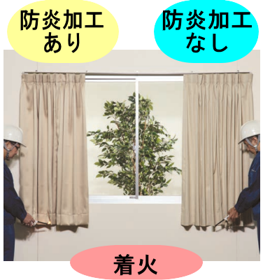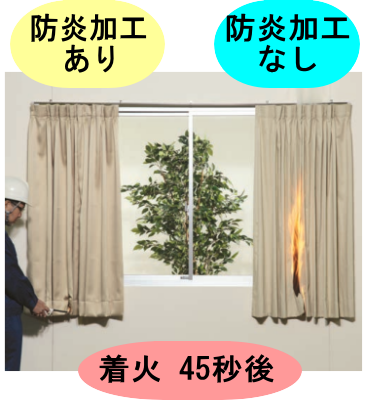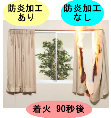 燃えにくく、火がついても燃え広がりにくいカーテンのこと