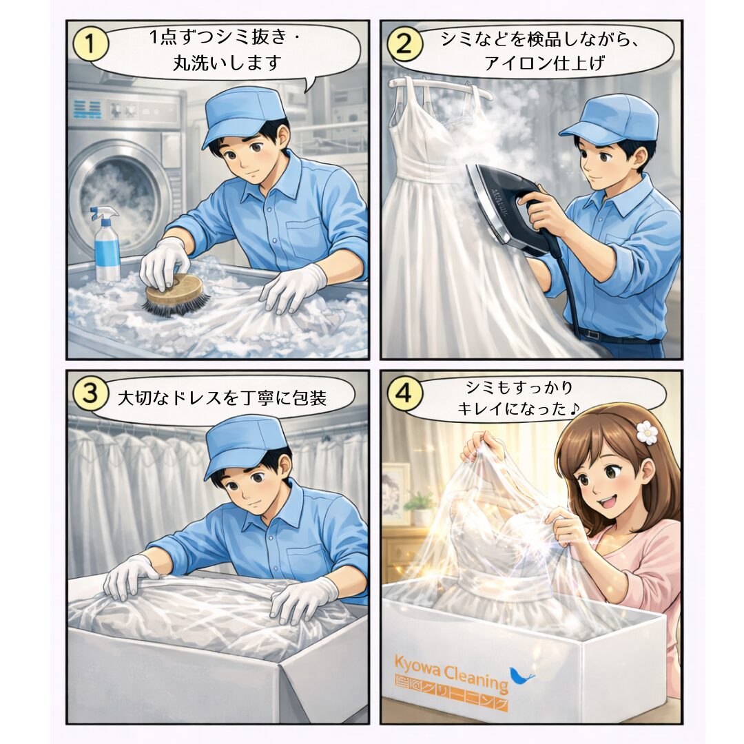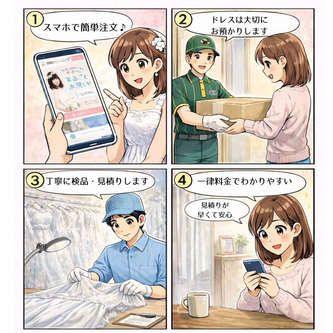 熟練スタッフが1点ずつ状態を見極め、最適な方法で丁寧に仕上げ。お客様の声も豊富に掲載されています。