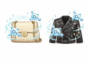 そのため、クリーニング後にオゾン消臭処理を行うことで、 バッグや財布、革ジャン、靴・ブーツなどに染みついた臭いの軽減が期待できます。オゾンは薬剤のように香りで臭いを覆い隠す方法ではなく、 臭いの元となる成分を分解するため、比較的自然な形で臭いを軽減できるのが特徴です。
