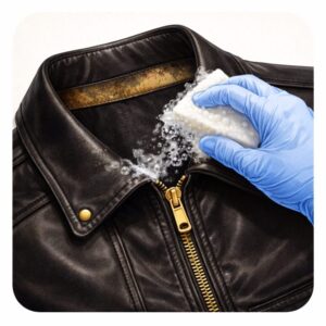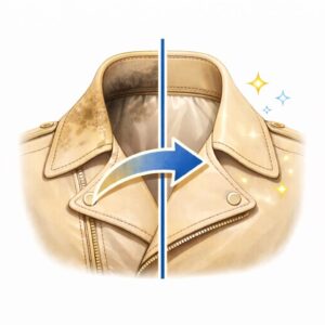 革ジャンの襟や袖口は、肌に直接触れるため皮脂・汗・化粧品・整髪料などの汚れが蓄積しやすい部分です。